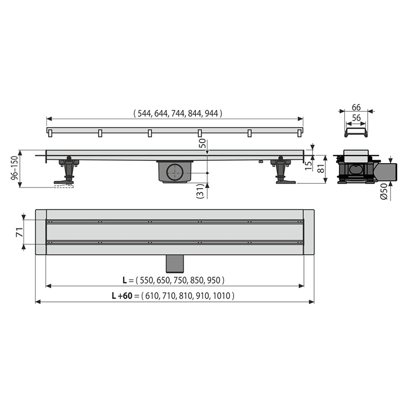 Set rigola de dus, AlcaPlast, Simple, cu capac, 55 cm